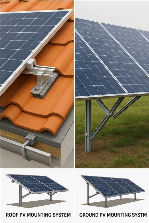 Sistem pelekap PV bumbung dipasang terus pada bumbung bangunan kediaman, komersial atau perindustrian. Mereka menggunakan struktur bangunan sedia ada untuk menyokong panel solar. Pemasangan boleh berbeza-beza bergantung pada jenis bumbung, seperti bumbung rata atau bumbung bercerun, dan selalunya memerlukan pendakap pelekap yang disesuaikan untuk memastikan penyepaduan yang selamat dengan bangunan. Sebaliknya, sistem pemasangan PV tanah dipasang di tanah lapang. Struktur sokongannya biasanya boleh laras, yang membolehkan pembangun mengoptimumkan orientasi panel dan sudut kecondongan untuk tangkapan tenaga suria maksimum. Berbanding dengan pemasangan atas bumbung, sistem yang dipasang di tanah biasanya mempunyai lebih sedikit sekatan dari segi ruang dan fleksibiliti reka bentuk, tetapi mereka memerlukan ketersediaan tanah sebagai prasyarat.