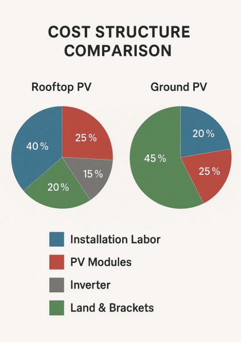 Kos adalah faktor penting apabila membandingkan kedua-dua sistem ini. Sistem PV bumbung biasanya mempunyai kos yang lebih rendah untuk kegunaan tanah kerana ia menggunakan struktur bangunan sedia ada. Walau bagaimanapun, kerumitan pemasangan boleh meningkatkan perbelanjaan jika bumbung mempunyai bentuk yang tidak teratur atau memerlukan tetulang. Sistem PV tanah biasanya mempunyai kos permulaan yang lebih tinggi disebabkan oleh penyediaan tanah, pembinaan asas dan struktur sokongan. Walau bagaimanapun, sistem tanah sering membenarkan skala ekonomi, menjadikannya cekap kos untuk projek besar. Keputusan pelaburan keseluruhan bergantung pada sumber tanah yang tersedia, output tenaga yang dijangka dan pulangan pelaburan jangka panjang.